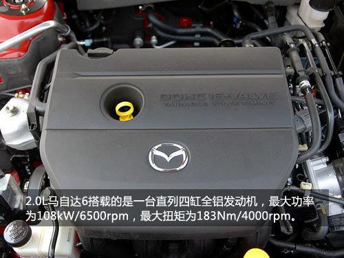2.0L马自达6搭载的是一台直列四缸全铝发动机,采用了S-VT可变气门正时控制系统、VIS可变进气歧管系统、VAD可变进气道等技术,最大功率为108kW/6500rpm,最大扭矩为183Nm/4000rpm。与发动机配合的6挡手动变速器和5挡自动变速箱。