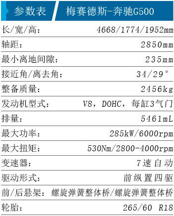 喜欢奔驰G-Class的人除了奔驰品牌,一定是喜欢它方方正正、比较原始的外观造型,这一代W463车型是于1990年推出的,也就是说它的车身结构以及内外造型已经有20年没有变过了,这也许就是所谓的经典。G-Class正式进入国内还是2009年的事,此前它一直是以G55 AMG的身份小批量进口。和其他硬派SUV不同,G500在原始的造型下透露出更多的科技气息,电子化仪表盘、GPS、自动空调等一应俱全,5.5升发动机配合7速自动变速器和4MATIC四驱系统也是专为越野服务的——它的发动机仍为每缸3气门和双火花塞结构,强调低速扭矩输出,另外它的7速变速器还具备挡位锁止功能,借此可以实现机械化的缓坡陡降功能。