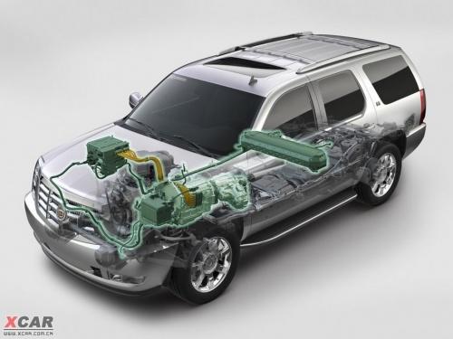 这款车装备两台各83Kw的电动马达,马达集成在EVT电子无级变速箱中。电力贮藏在车体底部的一组镍氢电池内,由汽油发动机的动力或者刹车时的能量回收系统来充电。 凯雷德Hybrid的汽油机和电动马达相互搭配可实现几种不同的工作状态,系统会根据车速、发动机负荷和踏板力度的不同自动在几种工况中切换,切换的过程比较顺畅,但只要细心体会的话还是可以感觉到。不过这并不会影响驾驶者的心情,动力切换瞬间的顿挫不会大于普通车型自动变速箱的换挡过程。