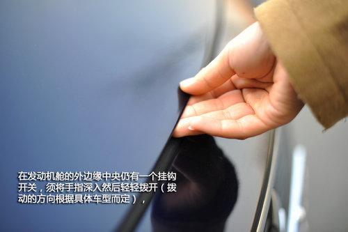 我们先从发动机舱来简单认识下(检查发动机舱要在熄火的状况下),一般情况下发动机舱的开启按钮都隐藏在主驾驶车门框的下部,轻轻抠动就可以打开发动机舱。在发动机舱的外边缘中央仍有一个挂钩开关,须将手指深入然后轻轻拨开(拨动的方向根据具体车型而定),然后通过支杆我们将发动机盖支起即可。
