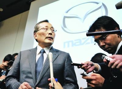 图为日本马自达汽车公司总裁山田宪昭18日在东京出席记者招待会的情形。该公司当天宣布,美国福特汽车公司对其持股比例将从11%降至3.5%,这将使前者丧失马自达最大股东身份。据悉,福特自1979年以来一直是马自达的最大股东,一度拥有马自达超过1/3的股份,自2008年全球金融危机爆发以来开始减持马自达股份。