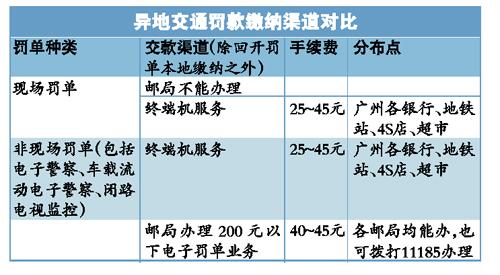 “银联便民支付点” 终端机目前在广州有2000台。广州本地车主缴纳除江门、阳江两地之外的异地罚单会收取每笔25~45元不等的手续费。据记者了解,交通违法异地办理系统将在年底于全省范围开通,广东车主在该终端机缴纳异地罚单将免收手续费。(文/表 周慧)