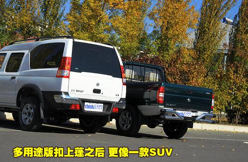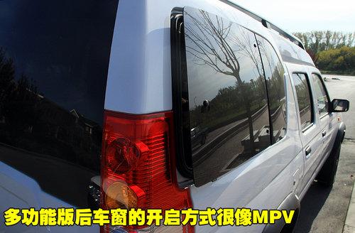 锐骐皮卡版和多用途版车型的尾门由于设计的不同,开启方式也是略有区别。多用途版的尾门可以采用选择掀起方式打开,而且内部的隔板也可以掀起,方便了前后排乘客的交流。而皮卡则只是一个简单的“斗儿”,不过值得一提的是这款车配备了原厂保险杠,并且增加了防装粱。