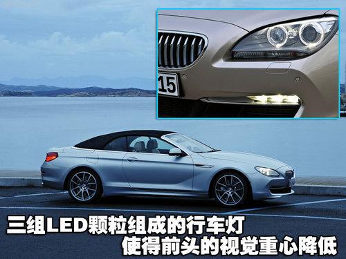 稍向前倾斜宝马双肾型格栅,更加宽大的进气口,引擎盖的肌肉轮廓,还有宽大的轮拱,这一切都暗示着眼前的这台全新宝马6系敞篷跑车拥有强大的动力和抓地能力。高品质的底部进气口镀铬装饰部件进一步突出了该车的宽度。由三组LED颗粒组成的行车灯被安置在这些铬件中间,使得前头的视觉重心降低。