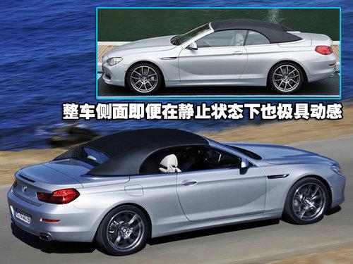 长轴距和肌肉感十足的轮廓线条体现了宝马敞篷车型的标准车身比例,宝马650i敞篷结合了经典的软顶设计, 使得整车侧面即便在静止状态下也极具动感。从后尾箱升起的两组敞篷支撑架,使得在关闭敞篷的状态下,全新6系看起来更像是一台硬顶双门跑车。