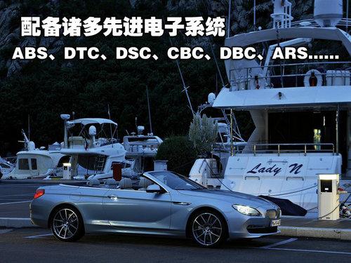 新6系配备了很多宝马引以为傲的电子系统,这包括由ABS和DTC(牵引力控制系统)组成的DSC(动态稳定系统)、CBC(转向制动控制系统)和DBC(动态制动控制系统)。另外为了给敞篷版车型提供更多的安全保护,宝马6系还配备了ARS(动态翻滚稳定系统)这套系统可以有效地减少汽车在高速状态下发生事故时的翻滚。