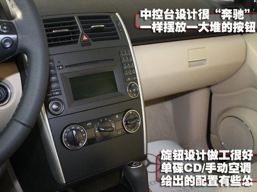 中控台的设计还是一贯的“大奔”范儿。这话怎么说?娱乐区两侧又见一大堆的按钮,中间的位置被CD和显示屏占据。空调区设计简易,上手零难度。A160毕竟是A160,“单碟CD+手动空调”的配置让这款“大奔”显得有些寒酸有些怂。