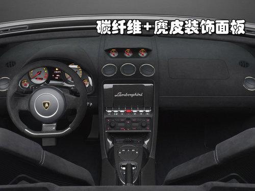 高性能敞篷版LP570-4采用全铝制框架结构车身,它的整备质量仅为1485千克。空气动力学套件运用了碳纤维材料,包括了侧裙、尾翼和分流器等。整车采用白色喷漆,我们能见到的黑色部分均为碳纤维。中控台和座椅被麂皮包裹,随处可见碳纤维面板。