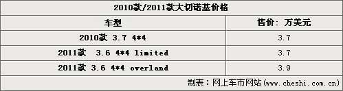 美国原装进口的JEEP2011款大切诺基四驱车型的limited售价为3.7万美元;overland版售价为3.9万美元,直观的看这个价格比2010款3.7升大切诺基的3.7万美元并未提升太多。