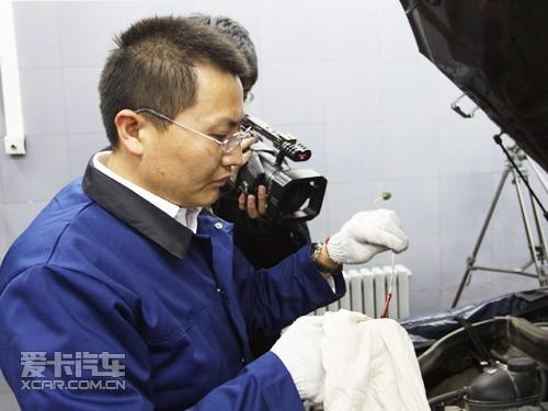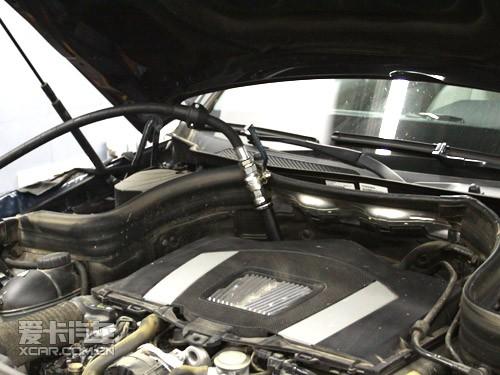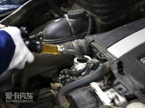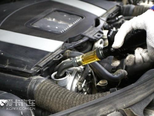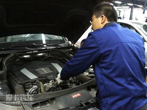 技术人员首先要做的就是更换机油,机滤。与其他品牌的车辆不同,奔驰更换机油的方式非常特别,不是与其他车辆一样将车辆架起后,从机油底壳放油,而是直接从机油尺处,将用过的机油通过抽油管直接抽走。