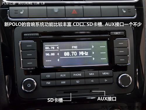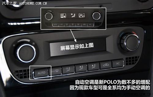 我们所拍到的车型拥有主副驾驶两级座椅加热功能,而ESP的控制按钮并没有出现。音响系统和高尔夫类似,功能也比较丰富,CD、SD、AUX三种音频播放方式都可以支持。自动空调是现款POLO所没有的配置,这也是新POLO增加的为数不多的配置。