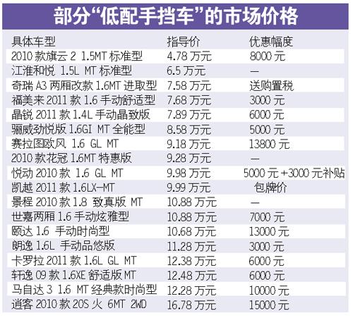 近日,记者接到一些读者的购车咨询电话,为了在“限行”期间每天都能开车出行,这些读者拟增购一辆车,而且目标多是低配手挡轿车。记者了解到,目前,选购低配版车型的消费趋势有上扬的表现。不过,经销商表示:低配版、尤其是低配手动挡的优惠未必更多,有时甚至缺货。本周我们为读者关注市场上的部分“低配手挡车”行情。