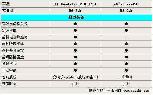 在舒适配置方面,奥迪TT Roadster与宝马Z4都配置定速巡航、电动座椅、自动空调、前后防撞雷达等,不过奥迪TT Roadster另外还配有电加热座椅及6碟CD系统,这点宝马Z4有些落后。另外在比较受关注的开蓬时间上,奥迪TT Roadster的软顶篷的开启时间要快很多,并且在50Km/h以内可自由开闭,而宝马Z4的硬顶则需要20秒。