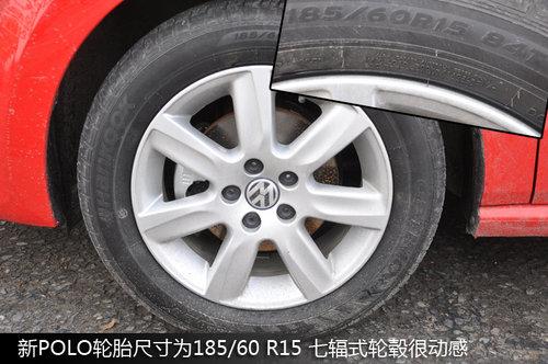 国产新POLO采用七幅铝合金轮毂,轮毂的样式比较漂亮。轮胎的尺寸为185/60 R15。双色的外后视镜也没有集成转向灯功能,车头的侧部增加了独立的转向灯。