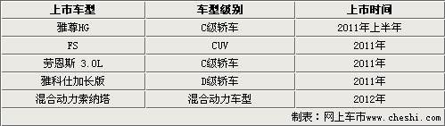 目前现代汽车在中国地区销售的车型有轿车劳恩斯、雅科仕,SUV车型新胜达、维拉克斯,跑车劳恩斯酷派以及刚刚上市的MPV辉翼,共计6款车型。再加上明后年引入的雅尊HG、FS、3.0排量的劳恩斯、混合动力的索纳塔和国人一直十分追捧的加长版车型-雅科仕加长版,现代汽车将会有10余款车型,其中中高级轿车占据了绝大部分,由此可见现代汽车将在豪华轿车市场上大有作为。