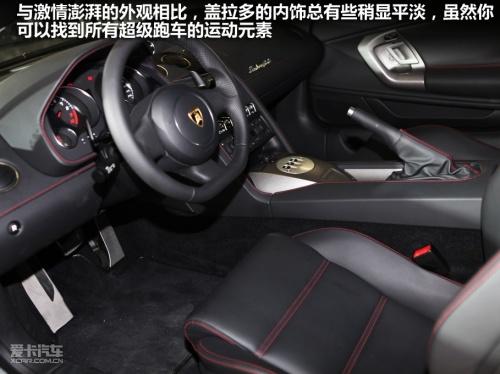 坐进低矮的驾驶室,第一感觉就是看似小巧的车身,其实还是拥有比较宽敞的内部空间。与激情澎湃的外观相比,盖拉多的内饰要平淡的多。真皮以及与车身颜色相搭配的缝线充斥着整个座舱,甚至能让你体会到很多大牌豪华厂商才能提供的豪华氛围。桶型座椅包裹力度非常强,只是你的屁股必须学会坐“硬板凳”。