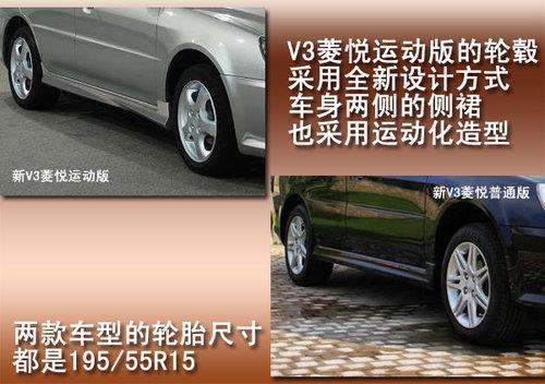 东南新V3菱悦运动版采用了全新的轮毂造型,复合式的条幅设计使运动版轮毂看上去更加时尚。而新V3菱悦运动版车身两侧的裙边则是采用空气动力学运动化设计,比老款更加运动。新V3菱悦运动版与现款V3菱悦都采用195/55R15轮胎,但新的V3菱悦普通版将采用14英寸轮毂。