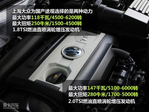 上海大众途观4个版本8款车型,分别搭载大众主打的1.8TSI及2.0TSI引擎,无论动力性能还是经济性都有着出色的表现,与之匹配的6速手动变速箱及爱信6速手自一体变速箱。