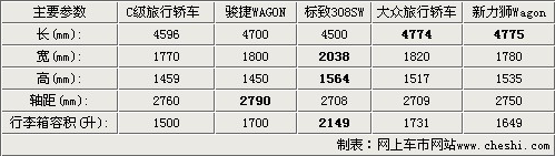 从上表看出,以奔驰C级旅行车、中华骏捷WAGON、标致308SW、大众迈腾旅行版和力狮WAGON为代表的旅行车占据着主要的旅行车市场。其中斯巴鲁力狮WAGON车型以超长的4775毫米车身,排名车长第一位。而标致308SW车型车身宽度达到了2038毫米。而在轴距方面,中华骏捷WAGON车型以2790毫米的长度胜出。在旅行轿车最重要的行李箱最大容积方面,标致308SW车型为最大2149升。