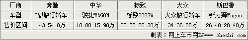 在五款车型中,奔驰C级旅行轿车最高售价已经达到了近55万元,而最亲民的中华骏捷最低售价仅仅只有10.88万元,相信我们接下来的介绍会有一款符合您的旅行车了。