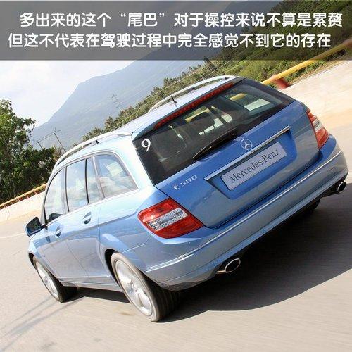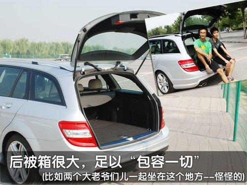 很多人会指着这款奔驰C级旅行车说:看,这不就是加了一个大尾巴吗?大家的看法我想是不无道理的。不过至少从外型上来说,C级旅行车与普通C级轿车除了正面上看几乎无法分辨之外其它的每一个角度C级旅行车都会显得那么与众不同。从B柱开始至车尾,奔驰C级旅行车的侧面线条由于外形的设计被拉伸的非常明显。车顶的两条铝合金行李架对于C级旅行车来说显得尤为重要,而如果车主选了了官方提供的套件,那么除了在车顶或是车尾加装自行车架之外,托挂上一台小拖车也是没有问题的。自行车、行李箱又或是滑雪板、冲浪板,任凭您能够想到的东西不妨都尝试着举到车顶上面——这真的是一种有趣的尝试。