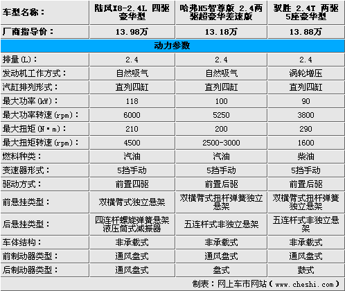 动力方面,三款车均配备了2.4L发动机,不过陆风X8和哈弗H5采用的是自然吸气方式,而江铃驭胜则配备了涡轮增压发动机,动力输出更加强劲。虽然在功率方面两款汽油版车型调校的都比较大,而驭胜只有90kw,不过最大扭矩方面驭胜便展现出了很大的优势。陆风X8采用前置四驱驱动方式,而其他两款车仅为前置后驱。