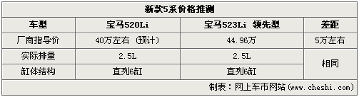 依照已经退市的老款5系两款车型的差价推测,新款523Li领先型也将比520Li贵出5万元左右。以现在新523Li车型44.96万的指导价来推断,宝马全新一代520Li售价在不出意外的情况下,将会出现在40万元左右,同时也很有可能低于这个敏感的价格底线。