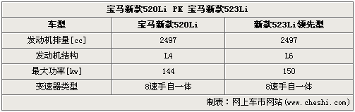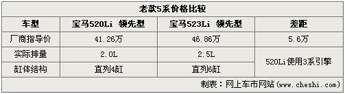 宝马老款5系入门级车型520Li领先型厂商指导价为41.26万元,相比宝马搭载2.3L发动机的523Li 领先型46.86万元的售价,两者相差5.6万元。价格的差距除了体现在配置丰富程度部分以外,关键部位发动机也存在本质的差别,520Li使用与3系一样的直列四缸引擎,而523Li则是搭载宝马当家直列六缸发动机。