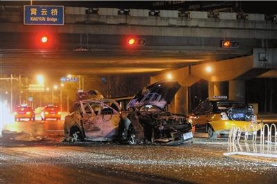 昨天凌晨3点多,记者在现场看到,肇事轿车烧得只剩框架,已经无法辨识具体车型。道路左侧一段近2米长的护栏被撞坏。受损的3辆出租车仍在原地,其中捷达出租车的后部已呈麻花状;另外两辆出租车的尾部被撞得凹了进去,几乎从三厢变成了两厢。多名民警正在现场勘察,不少过路的的哥纷纷停下车,走上前查看情况。看到这3辆出租车受损严重,他们都关切地询问:“撞得太严重了,也不知道司机怎么样了。”