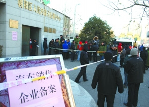 昨日上午11点,日坛北街的朝阳商务委办公大厅院外,等待递交备案材料的汽车销售人员排着二三十米。周围拉起警戒线,每个排队者都身着羽绒服,都是有备而来。
