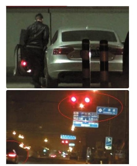 刘刚被曝驾驶奥迪车(下方红圈处)闯红灯(上方红圈处)。 图片来源新浪微博
