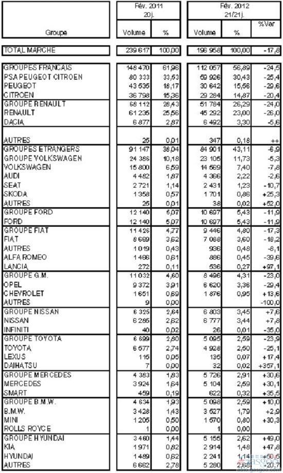参与互动(0)2012年3月1日,法国汽车制造商协会CCFA(Comit des Constructeurs Franais d'Automobiles)发布了法国2月份汽车注册量(以下同“销量”)数据。无论是乘用车还是涵盖轻型商用车的总销量,同比降幅均在20%左右。