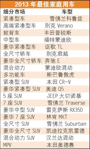 美国媒体《美国新闻与世界报道》近日公布了2013年最佳家庭用车的评选结果。“美国新闻最佳汽车”的总编辑杰米·迪顿说:“我们创立这个奖项是为了帮助家长们买到可以让生活更轻松的小汽车、SUV和货车。”最佳家庭用车奖项综合考虑了品质、大小、家庭适用性。