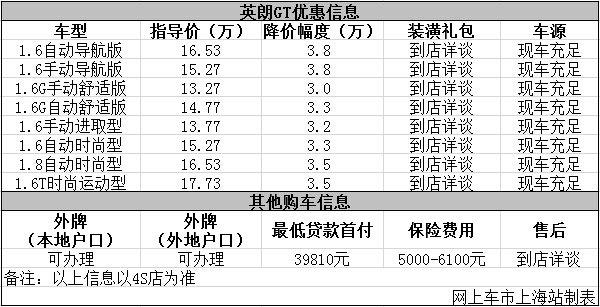 日前网上车市上海站从上海协通别克4S店了解到,目前该店英朗GT车型优惠出售,具体信息见下表: