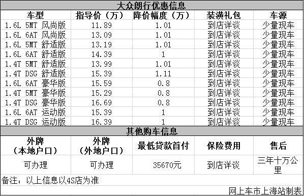 日前网上车市上海站从上海徐汇大众4s店了解到,目前该店大众朗行优惠出售,详细请见下表: