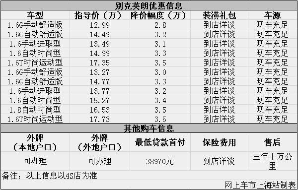日前网上车市上海站从上海协通鹏骋4S店了解到,目前该店别克英朗优惠出售,详细请见下表: