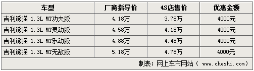 据吉利4S店销售人员介绍,吉利熊猫手动版的高配车型可满足消费者需要,而低配的车型较少。目前主推4.58万的灵动版和4.88万的乐动版两款车型,手动版全系可给出4000元的优惠。全新的升级版熊猫也将在近期分批到店,届时升级不加价的新车仍可享受店内的优惠幅度。另外,销售人员表示,目前店内没有自动版的新车,仅接受预订,订金5000元,新车将在下月中下旬分批到店。