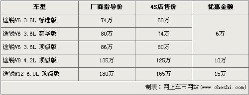 途锐是大众首款引进我国的SUV车型,在3.6L及4.2L率先上市后,大众为了满足消费者的更大胃口,紧接着又推出了搭载12缸发动机的6.0L车型。随着大排量消费税的颁布,给9月份后入关的大排量车型带来了一次不小的冲击,令大排量汽车价格都上调了不少,大众途锐6.0L顶级版也从原来158万元的价格上调至了180元。近日据网上车市价格数据监测显示,大众途锐全系的最高优惠达到了15万元,具体详情请看下表: