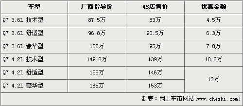 据销售人员介绍,奥迪Q7分为3.6L和4.2L两种排量共7款车型,目前全系最高优惠为12万元。3.6L车型最高优惠7万元,其中最低配的技术型优惠后售价降到了83万元,3.6L舒适型售价降到了90.5万元,3.6L豪华型售价95万。排量更大的4.2L车型优惠最高更是达到了12万元,4.2L舒适型售价降到146万元,4.2L豪华型售价降到了153万。