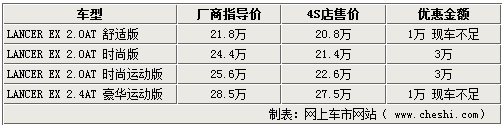 据经销商透露,店内在售LANCER EX开始加大优惠促销幅度。两款优惠幅度较大的车型均有现车,且颜色较全,在原价基础上最高优惠30000元,而需预订的低配及高配两款车型也有万元的优惠,加上商家赠送免费保养或保险等,现在购买三菱LANCER EX比较超值。