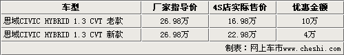 作为东风本田以整车进口形式引入国内销售的思域混动力车型,自上市以来销量的逐年递增并获得了良好的市场反响,而它的继任者新款思域混动力也于今年6月份正式上市销售。近日根据网上车市价格检测系统显示,本田混合动力思域出现了大幅优惠,新款车型优惠4万元,老款车型优惠幅度更是达到了10万元。具体车型售价见下表: