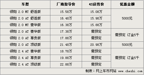 笔者从北京地区经销商处了解到,目前领翔全系优惠幅度仍然保持在5000元。据店内销售人员介绍,除2.0舒适型和豪华型有部分现车供应外,其他款仍需要预订,订金为5000元,15个工作日内便可以交车。目前销售的领翔在原来车型基础上增加了2.0自动舒适与2.0手动豪华两款车,并在配置上有一定调整。消费者可到店内试驾体验,了解详细车型情况。