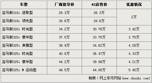新宝马3系在去年12月份正式在国内市场正式上市销售,经过改款后的3系从外观的流线,到内饰的风格均有一定程度的变化,带给消费者的是全新的视觉冲击和驾驭乐趣。根据网上车市价格监测系统显示,新宝马3系车型全系出现了不同的现金优惠,最高优惠达到了5.45万元,具体车型价格如下: