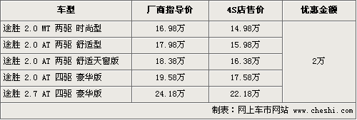 北京现代途胜SUV是国内销售较早的SUV车型,上市之初销量一直在SUV市场一枝独秀,但随着同级车的竞争加大,途胜也面临更新换代,预计新款将在明年推出。目前在售的车型可以优惠2万元现金,具体行情如下: