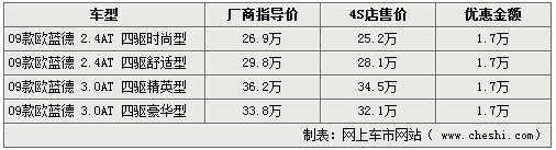 欧蓝德是三菱汽车第一款采用轿车底盘形式生产的SUV,沿用了三菱Lancer(蓝瑟)轿车的平台,具有轿车乘坐的舒适性,同时它又有SUV的特性。根据网上车市价格检测系统显示,目前欧蓝德车型主要为09款车型,最高让利达1.7万元。具体车型以及价格如下: