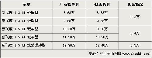 新飞度是广州本田去年7月份上市的车型,其是广州本田经济型轿车的主力军,外形比起老款飞度更加前卫更加时尚,创新的动感另类驾驶舱更是一大亮点。近日据网上车市网站价格系统监测显示,新飞度全系最高优惠金额为5000元,具体详情请看下表: