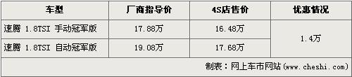 速腾冠军版可以说是一汽大众继老款宝来后,又一款可以称得上是“驾驶员之车”的车型。出自大众先进的PQ35平台,再加上配备缸内直喷的1.8TSI发动机,更宽的轮胎这一切的“与众不同”使得速腾冠军版收到了许多膜拜性能的消费者的喜爱。据了解,速腾1.8TSI出现了1.4万元的优惠,具体价格详情请看下表: