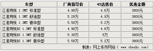 江淮的同悦及同悦RS系列车型,自上市后就吸引了众多消费者关注。在三厢车型销售很长时间之后,两厢的RS版终于进入了北京市场开始销售。网上车市网站由江淮轿车经销商处了解到,现在RS版以及三厢同悦车型店内现车充足,购车最高可有3800元的现金优惠。具体详情如下: