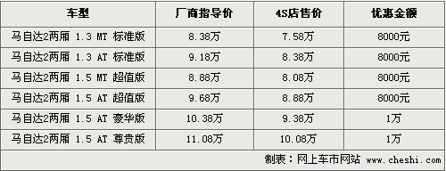 长安马自达2系列车型在推出后备受关注,尤其两厢车灵活多变的车身颜色和流线型的外观非常惹人喜爱,三厢车总体的空间上也能满足普通家庭出行的需要,是经济型轿车中的一款精品。目前笔者了解到,马自达2系列最高优惠幅度已经过万,具体车型以及价格如下列表: