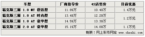 据4S店销售人员介绍:目前福克斯三厢1.8升三款车型现车充足,尤其银色、灰色、蓝色、黑色车型现车较多,手动挡车型目前优惠1.4万元,优惠后仅售10.49万元,1.8升自动版车型优惠1.2万元。2.0升车型目前现车较少,颜色也不齐全,订车需等待3周左右,目前优惠1.1万元。